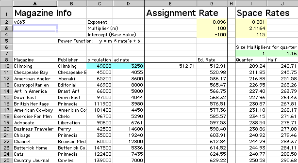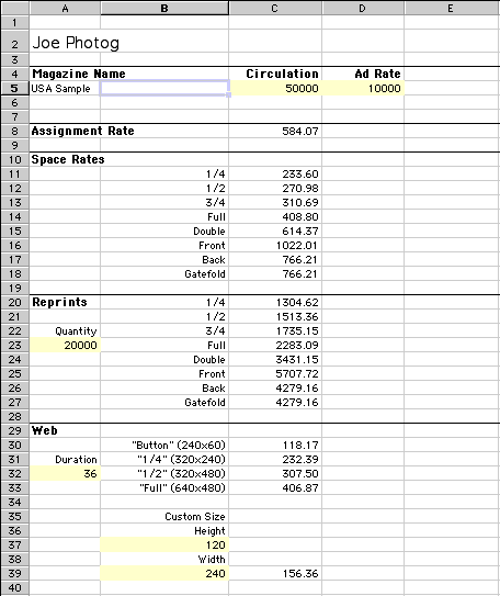 | Quote Screen The spreadsheet consists of two layers, the quote screen and the editorial rate screen. The quote screen contains seven yellow boxes to be modified: magazine circulation, magazine ad rate, currency exchange rate, the quantity of reprints, duration of web usage (in months), and the height and width of the web image (in pixels). Not: the exchange rate box is not shown below. Simply change the numbers according to the usage required and the result is a printable quote page. ![]() Editorial Rate Screen The editorial rate screen is much more complex and allows one to see many rates simultaneously. The yellow boxes are algebraic parameters for a power function that control the curve, magnitude and baseline of a given equation. The green boxes hold multipliers to determine the relative prices of space rates to the price of a 1/4 page. The blue boxes are magazine information or other usage information needed to calculate price. The equation for editorial assignments and space rates are straight forward but the web equation is much more complex because it uses five parameters to calculate the corresponding price. Please note that the web pricing can be calculated to the specific area of the image used. This will help to differentiate the many uses that exist on the web as compared to magazine print. To view the entire editorial rate page (230k), click here. For an explanation of how the formulas were derived, click here. |