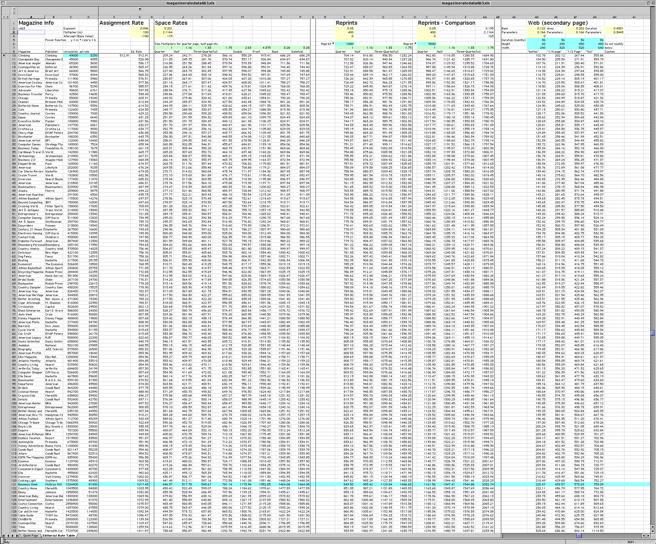 | Quote Screen The spreadsheet consists of two layers, the quote screen and the editorial rate screen. The quote screen contains seven yellow boxes to be modified: magazine circulation, magazine ad rate, currency exchange rate, the quantity of reprints, duration of web usage (in months), and the height and width of the web image (in pixels). Not: the exchange rate box is not shown below. Simply change the numbers according to the usage required and the result is a printable quote page. ![]() Editorial Rate Screen The editorial rate screen is much more complex and allows one to see many rates simultaneously. The yellow boxes are algebraic parameters for a power function that control the curve, magnitude and baseline of a given equation. The green boxes hold multipliers to determine the relative prices of space rates to the price of a 1/4 page. The blue boxes are magazine information or other usage information needed to calculate price. The equation for editorial assignments and space rates are straight forward but the web equation is much more complex because it uses five parameters to calculate the corresponding price. Please note that the web pricing can be calculated to the specific area of the image used. This will help to differentiate the many uses that exist on the web as compared to magazine print. To view the entire editorial rate page (230k), click here. For an explanation of how the formulas were derived, click here. |